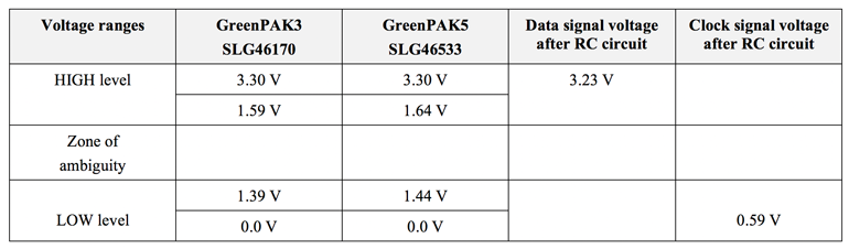 通過RC元件后收到的數(shù)據(jù)信號電壓必須在邏輯一個電壓的一定范圍內(nèi)(圖2的綠色區(qū)域)。 時鐘信號電壓不應(yīng)通過RC元件,也不應(yīng)超出邏輯零電壓范圍(圖2的紅色區(qū)域)。 它們之間有一個模糊區(qū)域,完全可能存在錯誤狀態(tài)。因此,必須選擇電容器的容量和電阻器的電阻,以使所有“充電/放電”瞬態(tài)電壓值都不會落入該區(qū)域。這樣做的方法如下: