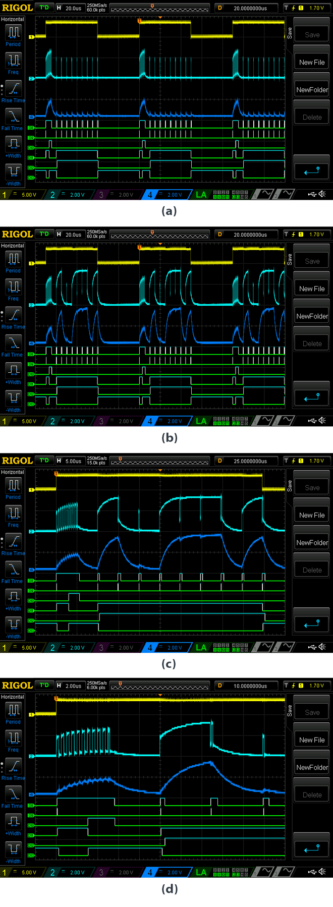 9.這些是“ Receiver_170”接收的示例。通道1(黃色)是CNT2,通道2(淺藍(lán)色)是RC電路之前的外部信號,通道3(品紅色)是RC電路之后的外部信號,通道4(藍(lán)色)是CLK。這些圖像顯示當(dāng)輸入信號為00000000(a),輸入信號為10010011(b),輸入信號為10010011(c)時以及信號值較高的單個周期的縮放視圖(d)。