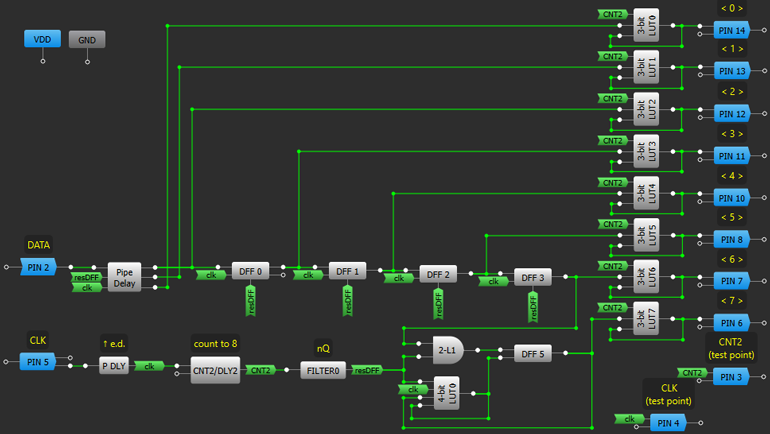 基于3位LUT0÷3位LUT7的八個鎖存器,用于將并行代碼饋入輸出PIN