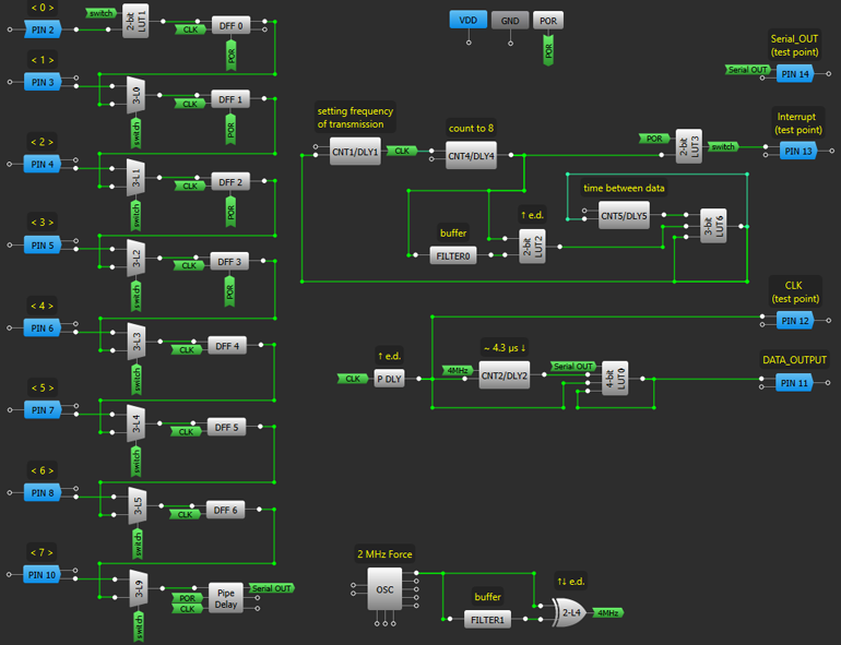 CNT1計數(shù)器定義了傳輸信號時間(如前所述,設(shè)置為?5 μs)。CNT4計數(shù)器形成八個這樣的時間段的數(shù)據(jù)包,并使用2位LUT3反相器控制2位LUT1、3位LUT0÷3位LUT5和3位LUT9多路復(fù)用器。當(dāng)來自2位LUT3反相器輸出的內(nèi)部“開關(guān)”信號為低電平時(圖7,“中斷”信號),則通過多路復(fù)用器記錄來自輸入PIN#2÷#8,#10的信息執(zhí)行相應(yīng)的觸發(fā)器。然后,當(dāng)“ switch”(“中斷”信號)信號變高時,觸發(fā)器上的數(shù)據(jù)發(fā)生移位,并形成一個串行代碼(圖7,“ Serial_OUT”信號)。