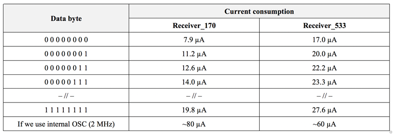 測得的電流值表明Receiver_533電路芯片消耗的電流略高于Receiver_170電路的電流。這是因為由于使用了附加的輔助服務(wù)位S1和S0,Receiver_533電路中的傳輸信號要長兩位。因此,可以總結(jié)出,帶有RC元件的芯片所消耗的電流遠(yuǎn)小于帶有OSC 2 MHz振蕩器的芯片所消耗的電流。