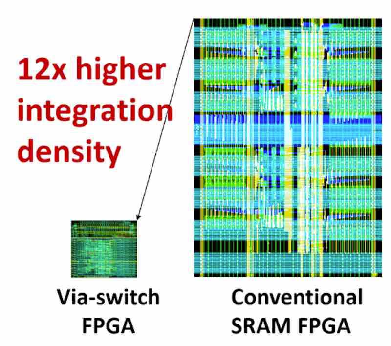 (大阪大學(xué)開(kāi)發(fā)的Via-Switch FPGA與常規(guī)SRAM FPGA在尺寸和集成密度上的比較)