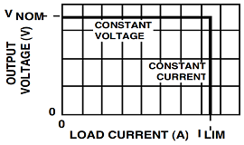 一旦電力系統(tǒng)中的組件進入飽和狀態(tài)(即,一旦負載電阻太低),為了安全起見,系統(tǒng)將需要進入恒定電流模式,并且系統(tǒng)應具有限流輸出。下面顯示了針對這種情況的理想系統(tǒng)負載線。實際負載線在低負載電阻下會有一些下降,并且系統(tǒng)應突然進入電流限制狀態(tài)。