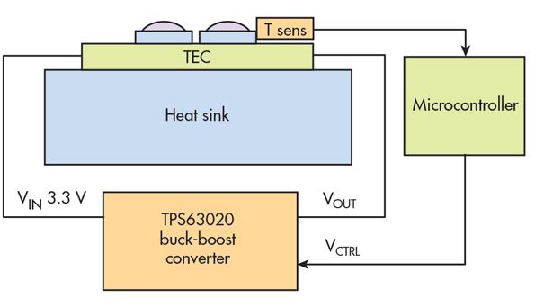 在整個(gè)系統(tǒng)(圖3)中,微控制器(MCU)監(jiān)視TEC上的溫度傳感器。根據(jù)TEC的實(shí)際溫度與所需溫度(設(shè)定點(diǎn)),MCU調(diào)整控制信號(hào)(V CTRL),以將降壓-升壓轉(zhuǎn)換器移至新的工作點(diǎn),以提供或吸收更多或更少的電流來(lái)調(diào)整溫度。