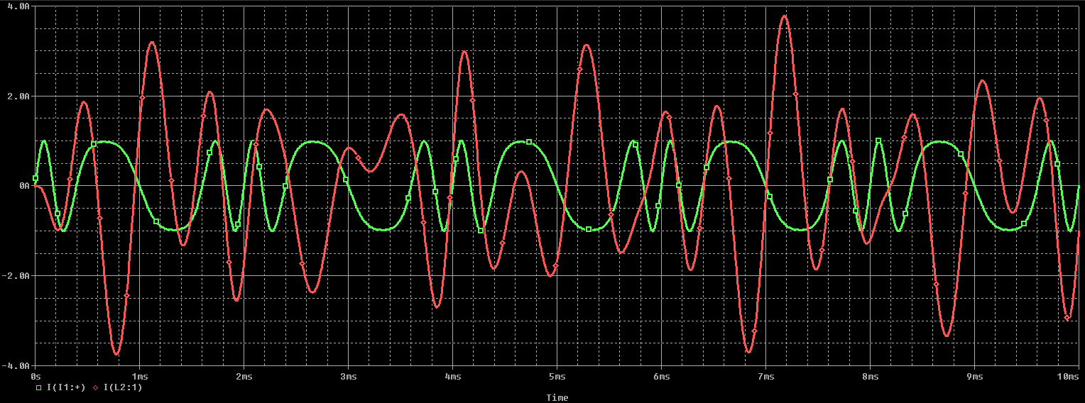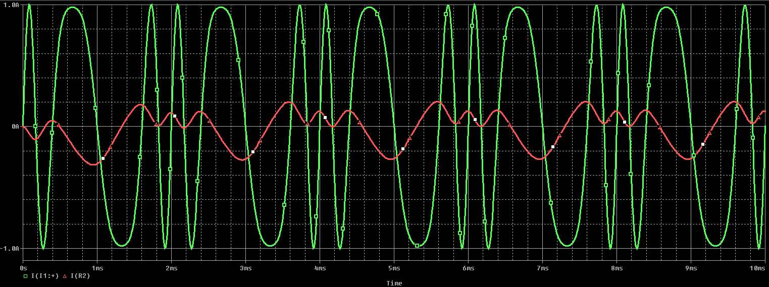 由于單個組件無法單獨檢查各個組件對輸入波形的影響,因此我們必須在較大的電路中查看這些組件。下圖顯示了一個簡單的電路,其中的FM源(1 A,1 kHz,調制指數為4)連接到Pi濾波器和電阻負載(R2)。這種類型的信號源具有很強的調制能力,在時域中很容易看出來,但是R2的時間行為并不總是很明顯。下面的Pi濾波器用作低通濾波器,但也可以通過互換電容器和電感器將其更改為高通濾波器。