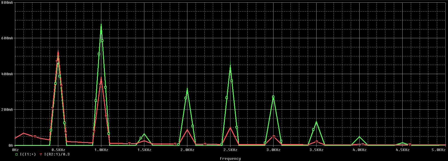 當您想在頻域中比較源信號和負載信號時,可以對上述結果進行傅立葉變換。為了真正了解信號中不同頻率分量的影響,您應該對負載處的電流波形進行歸一化,以使峰值負載電流等于時域中的峰值源電流。下圖顯示了電路如何在頻域中影響FM信號。在紅色軌跡中,會出現輕微的滾降,但這不是由于Pi濾波器的傳遞函數引起的,因為我們正在處理低頻信號。