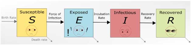 首先,要考慮一個(gè)島嶼,即我們的系統(tǒng),不允許人們進(jìn)出。每個(gè)人在給定時(shí)間都可以處于以下狀態(tài)之一:“易感”,“感染”和“已康復(fù)”,因此縮寫為SIR,因?yàn)閺奈椿歼^該?。?span>S)的人很有可能會(huì)生病并在一定時(shí)間內(nèi)感染(I),然后恢復(fù)(R)。就新型冠狀病毒而言,將模型擴(kuò)展為附加狀態(tài)“已暴露”是適當(dāng)?shù)模园ň哂胁《镜形锤腥镜娜耍?span>SEIR模型)。