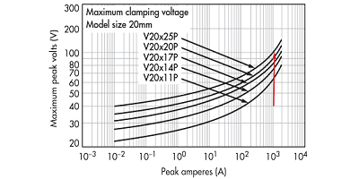 步驟2: 要確定要使用的MOV光盤大小,請首先確定最小滿足1000-A浪涌要求的MOV系列。檢查上表建議使用20毫米MOV和31伏直流最大連續(xù)額定電壓(部件號V20E25P)作為滿足要求的可能解決方案。