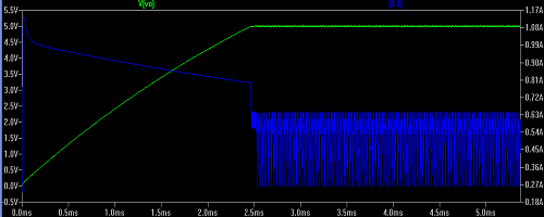 瞬態(tài)分析使您可以看到輸出紋波,穩(wěn)定的電壓電平以及電壓紋波與其他組件中的電壓/電流的比較。下面顯示了在上述調(diào)節(jié)器級(jí)中將輸出電壓與電感器電流進(jìn)行比較的示例。下圖還顯示了低輸入電壓的結(jié)果。掃描輸入電壓時(shí),您可以生成多個(gè)圖形并確定電壓電平何時(shí)停止增加(即,穩(wěn)壓器中的MOSFET何時(shí)飽和)。