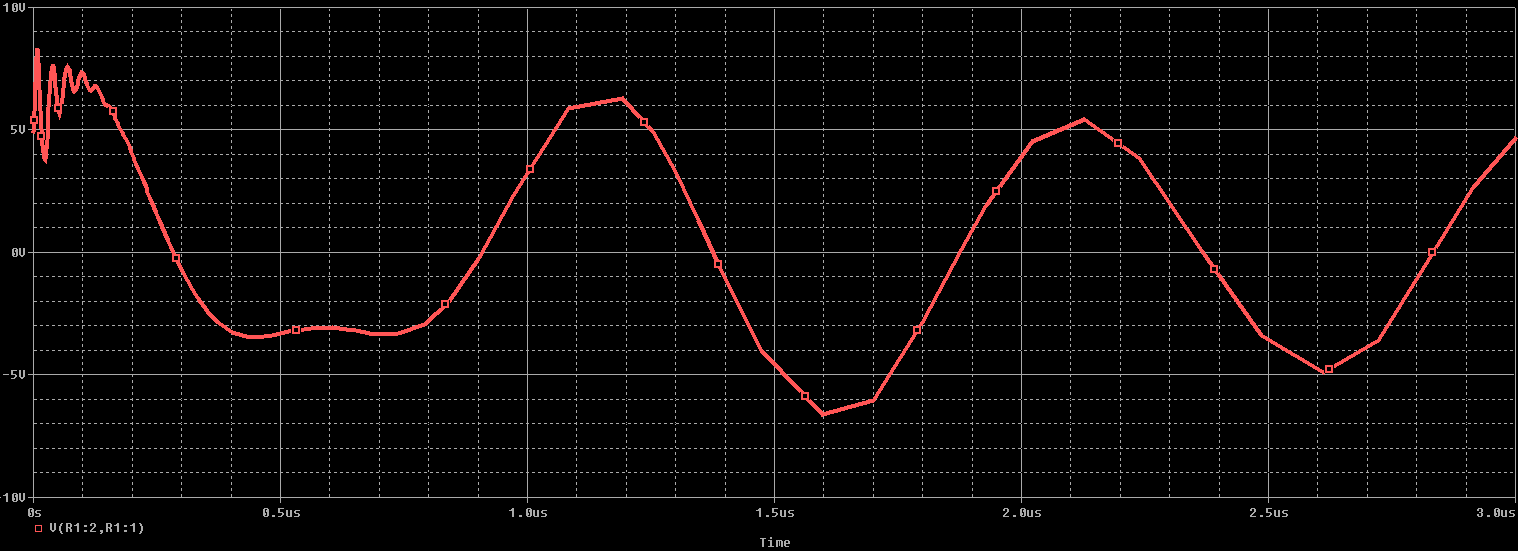下面顯示的瞬態(tài)分析結(jié)果說明了模擬電路的靈敏度-1 MHz信號最初顯示出輕微的瞬態(tài)響應(yīng),峰值幅度高達(dá)8V。接收到的FM信號的調(diào)制也被疊加在負(fù)載上看到的電壓上。此示例中存在明顯的干擾,該干擾將傳播到負(fù)載組件中。