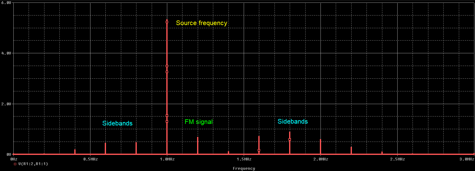 運(yùn)行于1 MHz的電路的傅立葉頻譜,該電路接收1.2 MHz的FM EMI信號