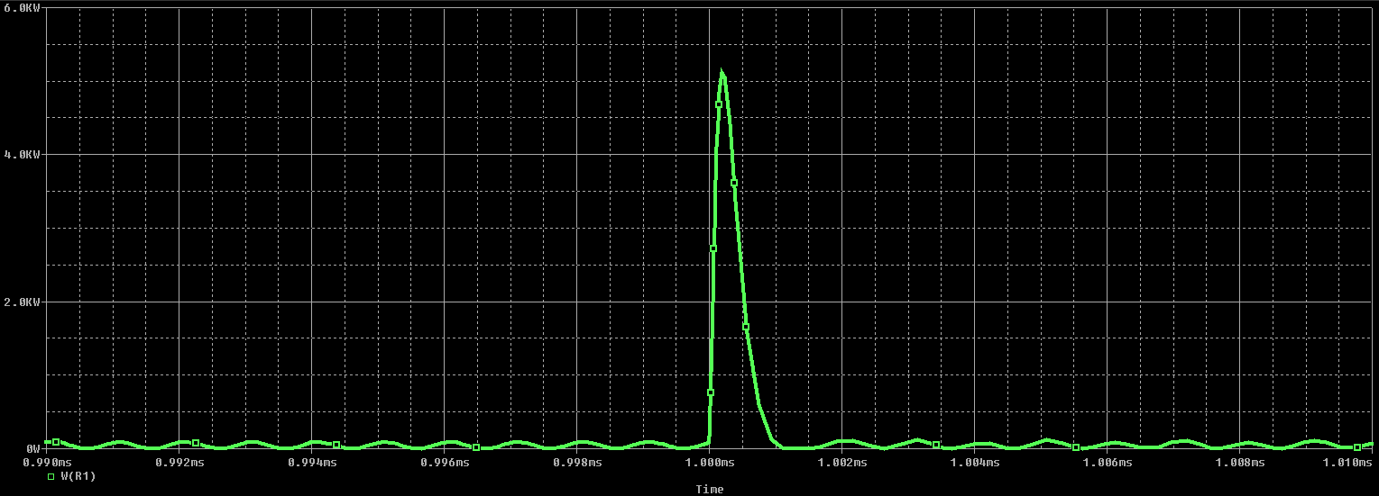 為了進(jìn)一步分析,可以在參數(shù)掃描中掃描 ESD事件的幅度,以顯示瞬態(tài)響應(yīng)在負(fù)載下如何變化。還可以將負(fù)載中的功率與其額定功率進(jìn)行比較,以確定這種事件是否會(huì)導(dǎo)致負(fù)載故障。如下圖所示。由于SPICE仿真可以計(jì)算每個(gè)節(jié)點(diǎn)的電壓和電流,因此可以輕松計(jì)算負(fù)載組件中的功率并將其放置在圖中。從該圖可以看出,負(fù)載中消耗的功率約為5 kW,足以破壞大多數(shù)組件。