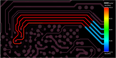 要檢查阻抗變化,請在分析工具欄中選擇“阻抗工作流程”選項。選擇相同的網(wǎng)絡(luò)以分析并運行仿真。可以通過選擇“阻抗視覺”選項來查看整個互連的阻抗,該選項將再次顯示帶有顏色編碼阻抗值的熱圖。