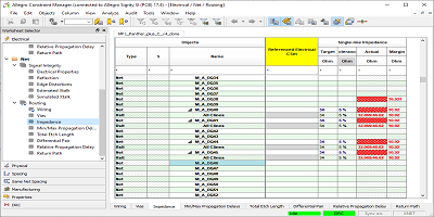 在上圖中,這四個網(wǎng)絡(luò)標(biāo)記為紅色,因為貫穿這些網(wǎng)絡(luò)的最小值和/或阻抗值均超出34±5%范圍(32.3至35.7歐姆)。約束管理器顯示阻抗范圍為32.069歐姆至46.62歐姆;這些值可以出現(xiàn)在這些網(wǎng)上的任何地方。這可能是由于與其他導(dǎo)體的意外寄生耦合,走線寬度的變化或在參考平面上的間隙上布線引起的。