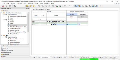 我們要檢查的四個跡線不是這些網(wǎng)絡(luò)組的一部分,但是如果需要,我們可以將這些跡線分配給這些網(wǎng)絡(luò)組。另一個選擇是在電氣約束集中單獨定義這些走線的阻抗約束。要應(yīng)用該規(guī)則,只需在約束管理器中向下滾動到電氣工作表中的“網(wǎng)絡(luò)”部分。當(dāng)打開“路由”→“阻抗”部分時,您將能夠看到所有網(wǎng)絡(luò)以及它們所屬的組。
