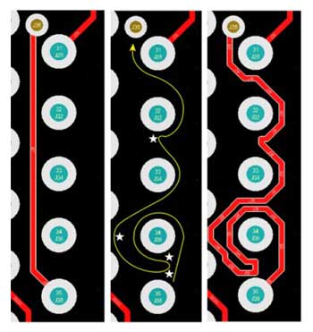 組件的放置和布線是PCB設(shè)計工具提供的原始功能,而這些功能對于當今的設(shè)計師仍然至關(guān)重要。當今先進的設(shè)計工具通過交互式布線來沿光標路徑放置布線部分,實現(xiàn)在障礙物上推動或行走,并自動跟隨現(xiàn)有連接,從而幫助較大化布線效率和靈活性。光標引導的布線使圍繞障礙物的復雜手動布線變得快速,輕松和直觀。用鼠標創(chuàng)建路徑,交互式布線器會嘗試根據(jù)該路徑放置軌道。圖1顯示了如何在光標移動引導的情況下快速創(chuàng)建復雜的路線。左圖顯示了一條正常的最小長度的路線,中圖顯示了光標路徑,星號表示單擊位置以提交路線的各個部分。正確的圖像是最終的布線。盡管是一個極端的示例,但它顯示了放置多個軌道所需的布線提交數(shù)量。