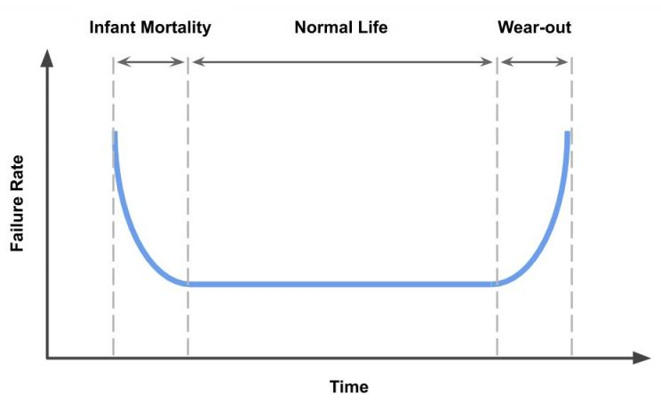 這些可靠性測試的目的是收集足夠的數據以形成浴盆曲線(示例如下所示)。不幸的是,“嬰兒死亡率”部分包括由于制造缺陷而導致的早期組件故障。這些測試通常在125°C下進行。